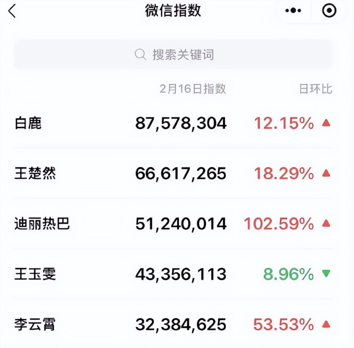 春晚戒指后,网上出现微信搜索指数,当晚热度最高的是白鹿,其次便是王楚然,然后是迪丽热巴,王楚然径直凭借春晚收效出圈了。
