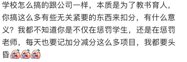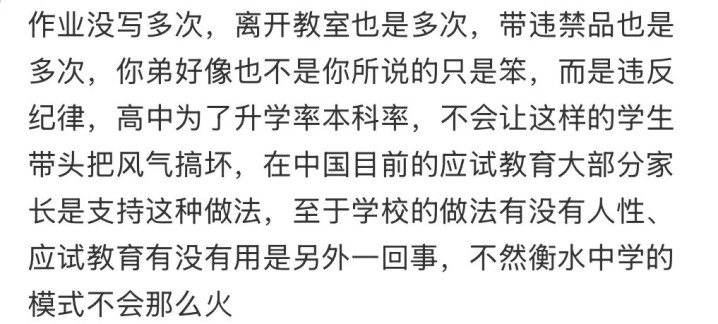还有网友认为,调查轨制神气沸腾令东说念主窒息,“天天推敲这样多若何精心学习”,仅看调查表,苏先生弟弟莫得环节极度,劝退处理过于淡漠。网友劝苏先生不要惊慌,转学粗野对弟弟是功德。