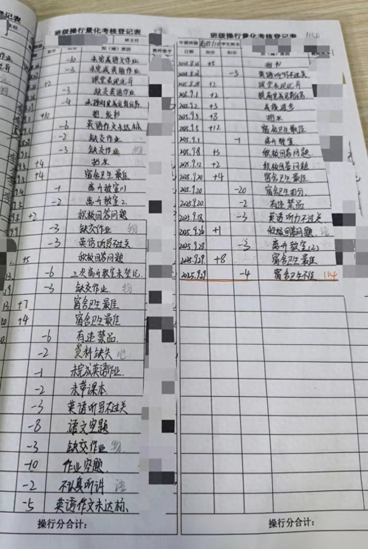 苏先生贴出了2025年9月份操行量化调查表:“课堂发扬优异+2”、“寝室卫生最好+4”、“积极回答问题+5”、“抬书发书+10”……当月加分总分为88;“离开教室-1”,“英语听写不外关-3”,“有犯禁品-6”,“功课空题-10”,“寝室卫生扣分-20”……当月扣分总分为127。