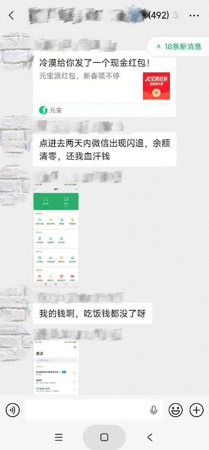 2月2日,一则网传的微信群聊图片显示,有病毒虚假链接伪装成元宝红包形式出现,诱导用户点进后致微信闪退,有用户余额因此清零,引发公众对于财产安全方面的担忧。