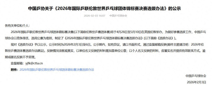 2026年2月3日,中国乒乓球协会在其官方网站正式发布了《2026年国际乒联伦敦世界乒乓球团体锦标赛决赛选拔办法》,为即将于4月底在英国伦敦举行的世乒赛团体赛敲定了国乒的参赛阵容选拔蓝图