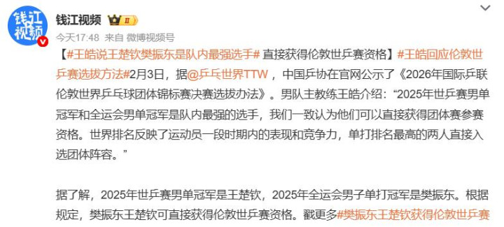 在这份备受关注的公示文件中,男队主教练王皓明确表示,2025年世乒赛男单冠军(王楚钦)和全运会男单冠军(樊振东)是队内最强的选手,他们可以直接获得团体赛参赛资格,此举意味着,凭借2025年第十五届全运会成年组男单冠军的辉煌战绩,名将樊振东已经锁定了一张直通伦敦的入场券