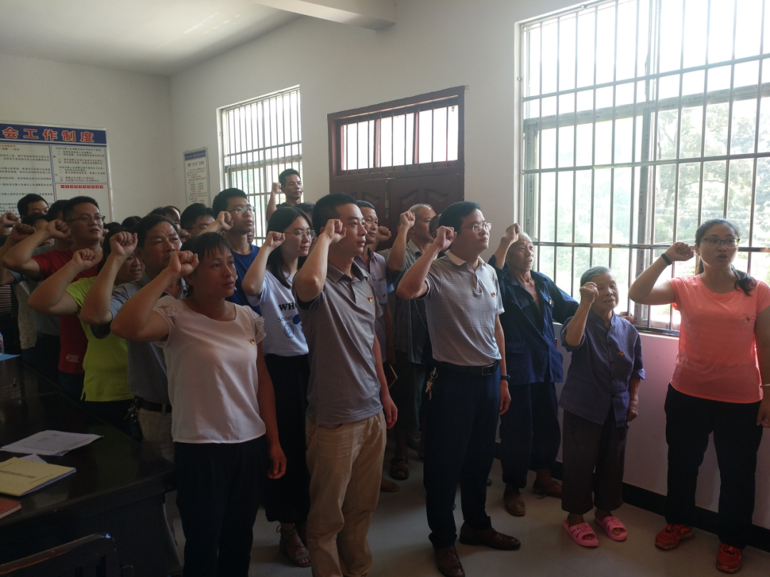 ▲文秀书记(右一)生前带百坭村党支部党员重温入党誓词。右三为周仲补爷爷。