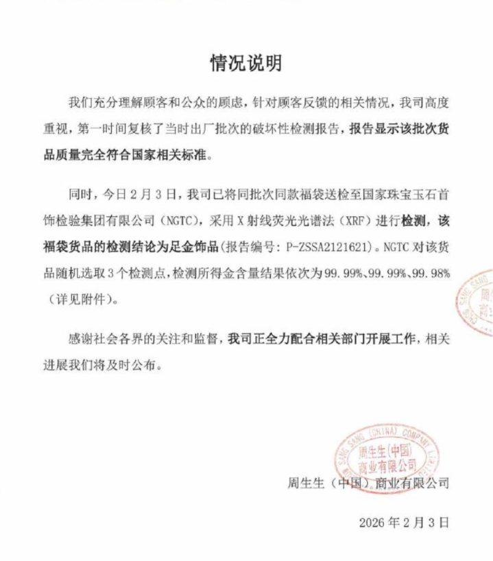 同时,今日2月3日,我司已将同批次同款福袋送检至国家珠宝玉石首饰检验集团有限公司(NGTC),采用X射线荧光光谱法(XRF)进行检测,该福袋货品的检测结论为足金饰品(报告编号:P-ZSSA2121621)。NGTC对该货品随机选取3个检测点,检测所得金含量结果依次为99.99%、99.99%、99.98%(详见附件)。