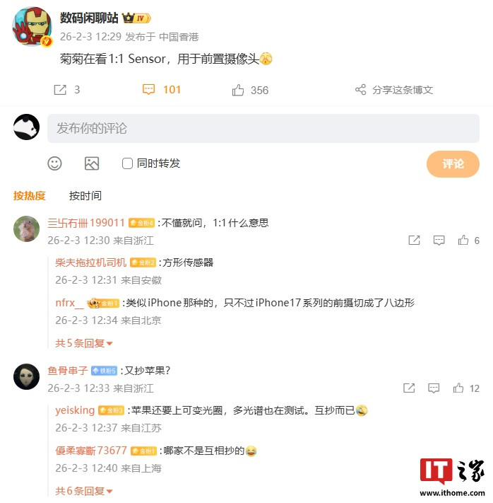 IT之家2月3日消息,博主@数码闲聊站刚刚发文透露,称菊菊(此处预计指代华为)在看1:1Sensor方形传感器,用于前置摄像头。这意味着如果该方案通过,华为新机的前摄将支持更多玩法。